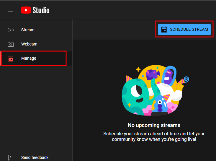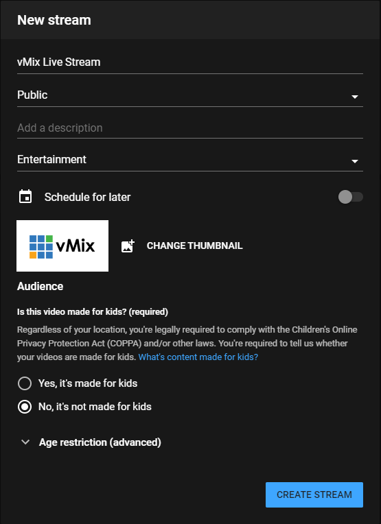 Select the Manage option from the left sidebar, then the Schedule Stream button. This will ask you to schedule a stream at a particular time. When you start the stream in vMix, you will also need to start the stream from the YouTube interface when ready. You can start it before the scheduled time if preferred.