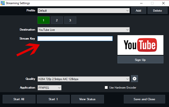 6. Open up the stream settings window in vMix. From the Destination dropdown menu, select the YouTube Live option. Underneath that will be a Stream Key field. Paste the Stream Key you have copied from Step 5 into this field.