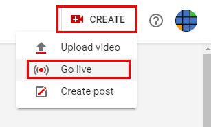 2. Up to the very top right of your screen, select the Create button and choose the Go live option. If this is your first time, you may need to wait 24 hours for YouTube to activate your account for live streaming.
